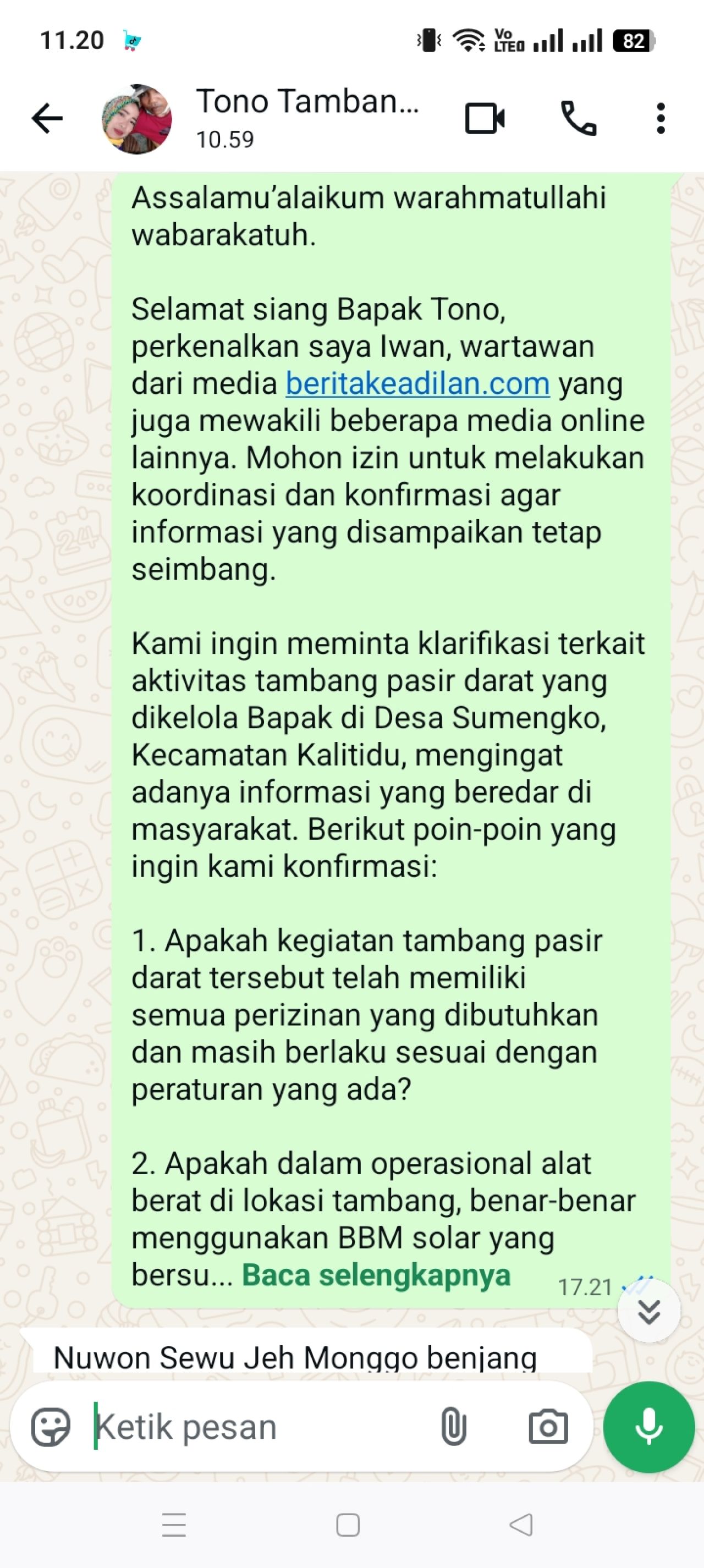"Nuwun sewu jeh, monggo besok datang ke lokasi saja ketemu sama yang punya tambang jeh" (Mohon maaf, silakan besok datang ke lokasi saja untuk bertemu dengan pemilik tambang), tulisnya.