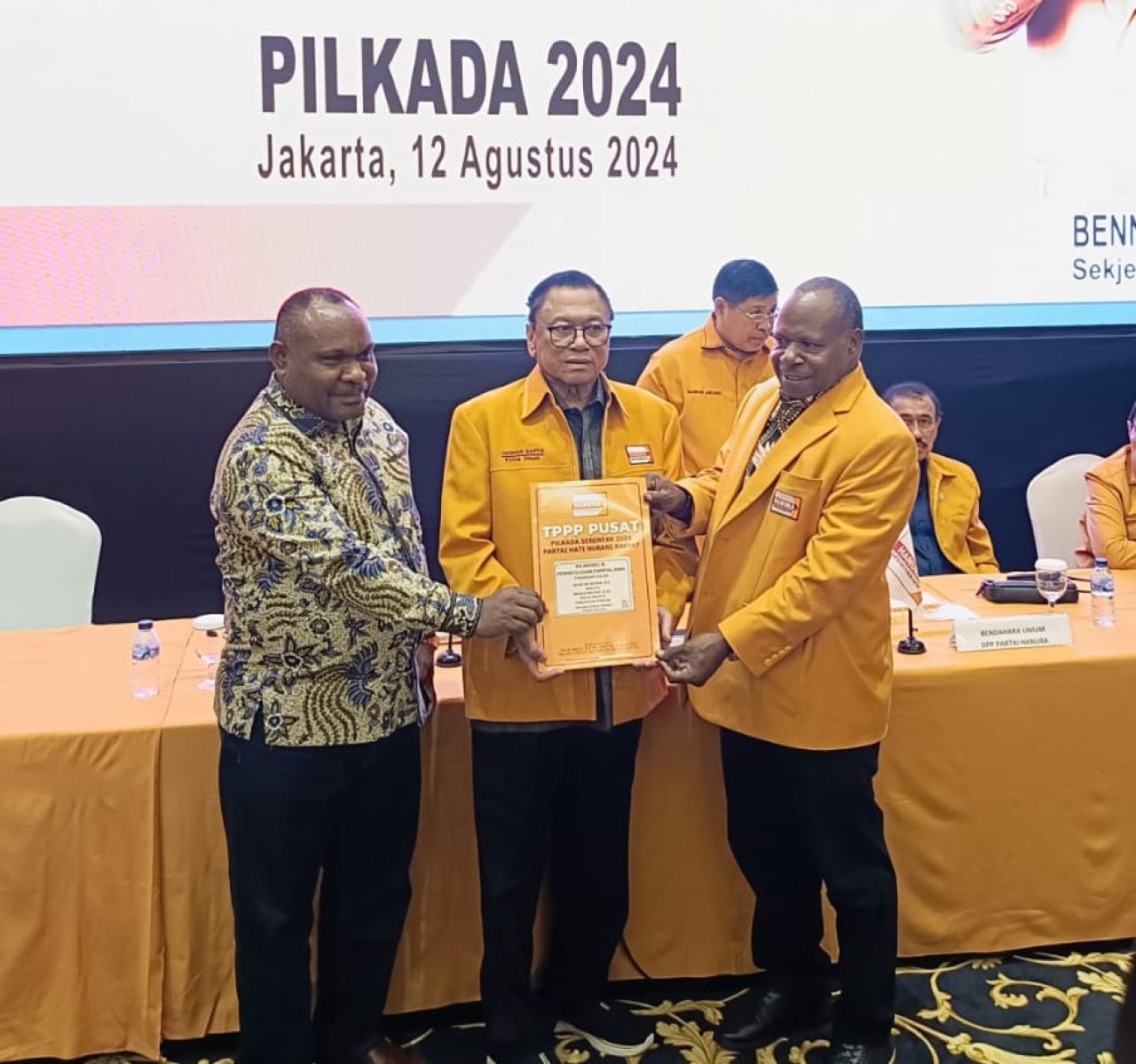 JAKARTA PUSAT (Beritakeadilan, DK Jakarta)- Bertempat di Ballroom kediaman Ketua Umum Partai Hanura, Dr (H.C) Oesman Sapta Odang di Jl. Prof. Satrio, Kuningan Jakarta Selatan, Pasangan Calon Bupati dan Wakil Bupati Kabupaten Puncak Provinsi Papua Tengah Periode 2024-2029 Alus UK Murib, SE dan Menas Mayau, S.Th menerima rekomendasi B1 KWK dari DPP Partai Hanura.
