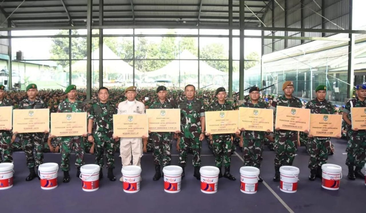 Pangdam Jaya kembali menjelaskan, “Bantuan cat ini agar dimanfaatkan untuk perawatan dan pemeliharaan rumah ibadah yang ada disatuan, “Pesannya.