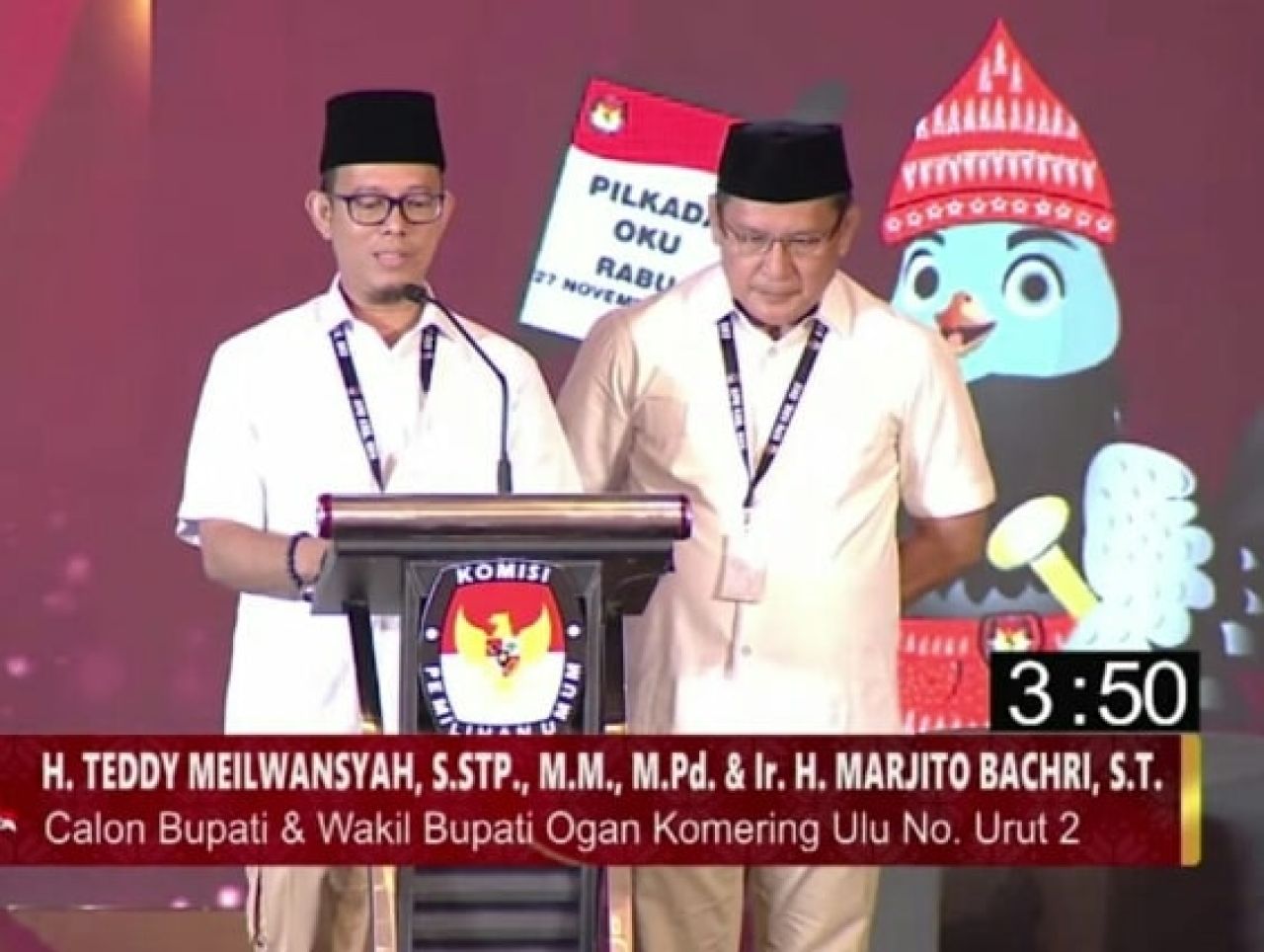 Pada saat sesi tanya jawab Paslon dengan tim panelis, tampak Paslon nomor urut 1 menjawab pertanyaan dari panelis hanya bersifat normatif, sedangkan Paslon nomor urut 2 (Bertaji) Pasangan H Teddy Meilwansyah (mantan Pj Bupati OKU) dan H Marjito Bachri (Mantan Ketua DPRD OKU) yang lebih berpengalaman di Pemerintahan baik Eksekutif maupun Legeslatif di Kabupaten OKU lebih unggul, mampu dan secara gamblang menjawab seluruh pertanyaan finalis.