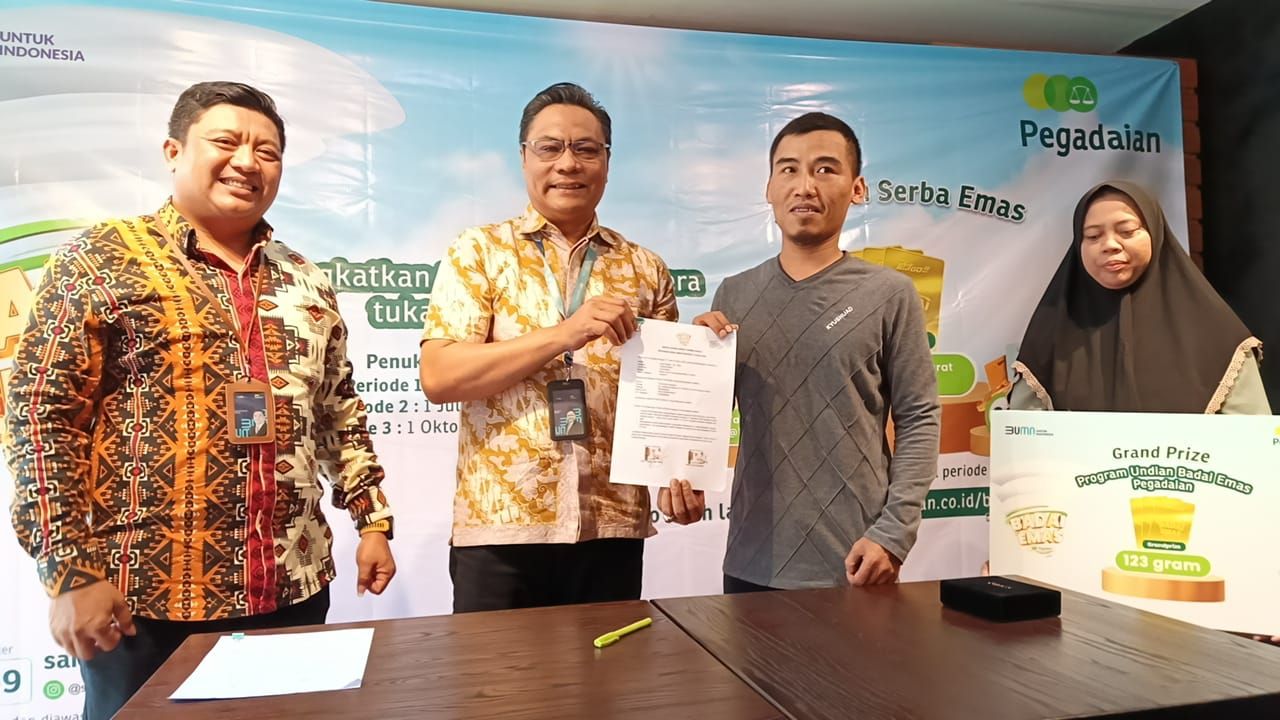 BOGOR (Beritakeadilan, Jawa Barat) – Deputy Bisnis Area Bogor PT Pegadaian Kanwil VIII Jakarta 1, Agus Riyadi, SE,M.M menyerahkan hadiah sekaligus menandatangani berita acara serah terima hadiah kepada Panji Eka Sukmana salah satu nasabah Pegadaian Cabang Bojongsari yang berhasil memenangkan grand prize logam mulia (Emas) seberat 123 gram pada program Badai Emas Pegadaian Periode 1 tahun 2024 di The Gede Coffee & Gold Pegadaian Pasar Mawar Bogor, Selasa (27/8).