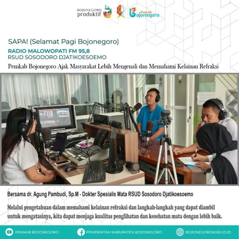 BOJONEGORO (Beritakeadilan, Jawa Timur) – Pemkab Bojonegoro melalui Dinas Komunikasi dan Informatika (Kominfo) dan RSUD Sosodoro Djatikoesoemo mengajak masyarakat untuk menjaga kesehatan mata dengan mengenali dan memahami kelainan refraksi. Ajakan ini salah satunya lewat program siar radio SAPA! (Selamat Pagi!) Malowopati FM, edisi Rabu (14/6/2023).