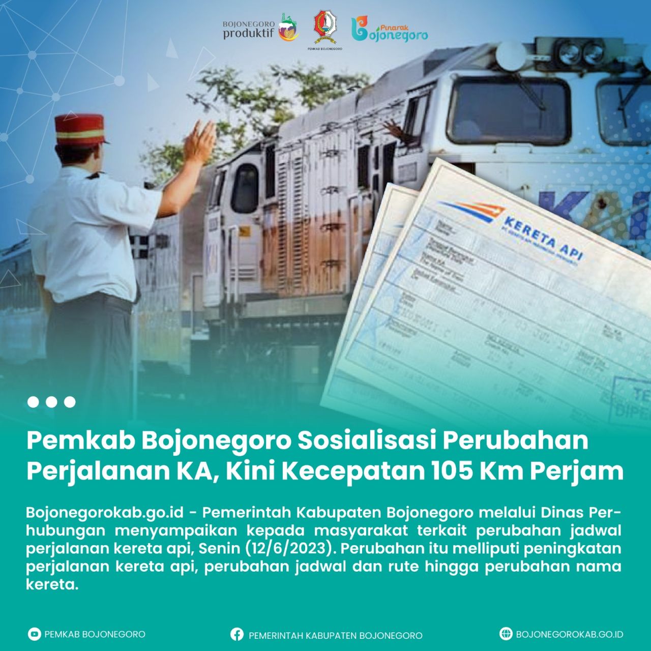 BOJONEGORO (Beritakeadilan, Jawa Timur) – Pemerintah Kabupaten Bojonegoro melalui Dinas Perhubungan menyampaikan kepada masyarakat terkait perubahan jadwal perjalanan kereta api, Senin (12/6/2023). Perubahan itu meliputi peningkatan perjalanan kereta api, perubahan jadwal dan rute hingga perubahan nama kereta.