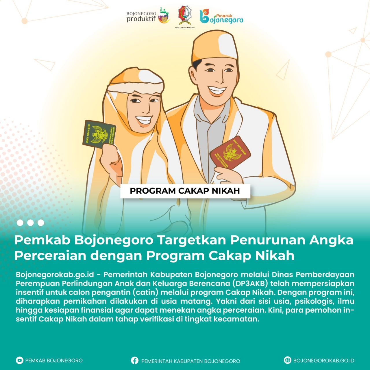 BOJONEGORO (Beritakeadilan, Jawa Timur)- Pemerintah Kabupaten (Pemkab) Bojonegoro melalui Dinas Pemberdayaan Perempuan Perlindungan Anak dan Keluarga Berencana (DP3AKB) telah mempersiapkan insentif untuk calon pengantin (catin) melalui program Cakap Nikah. Dengan program ini, diharapkan pernikahan dilakukan di usia matang. Yakni dari sisi usia, psikologis, ilmu hingga kesiapan finansial agar dapat menekan angka perceraian. Kini, para pemohon insentif Cakap Nikah dalam tahap verifikasi di tingkat kecamatan.