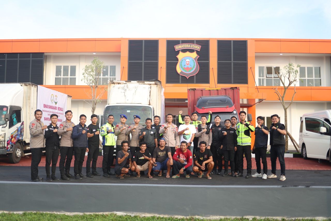 Pengawalan Bantuan Logistik Bencana Banjir Bandang dari Polda Sumsel Tiba di Mapolda Sumut