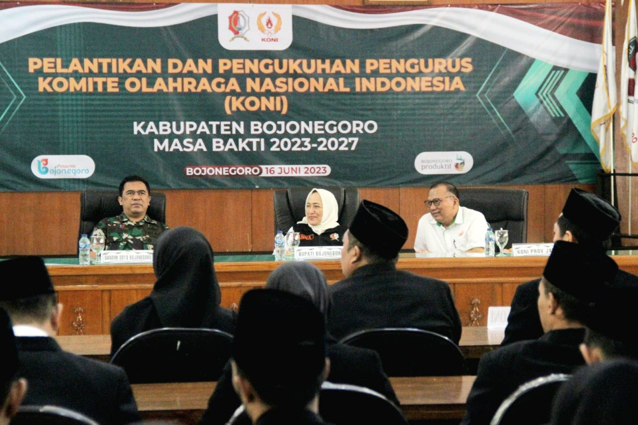BOJONEGORO (Beritakeadilan, Jawa Timur) – Bupati Bojonegoro Anna Mu’awanah beserta Forkopimda menghadiri pelantikan dan pengukuhan pengurus Komite Olahraga Nasional Indonesia (KONI) Kabupaten Bojonegoro masa bakti 2023-2027. Acara digelar Jumat (16/6/2023) di Ruang Angling Dharma Lantai II Gedung Pemkab Bojonegoro. Pengurus akan fokus pada pembibitan atlet serta cabor potensial menjadi fokusnya.