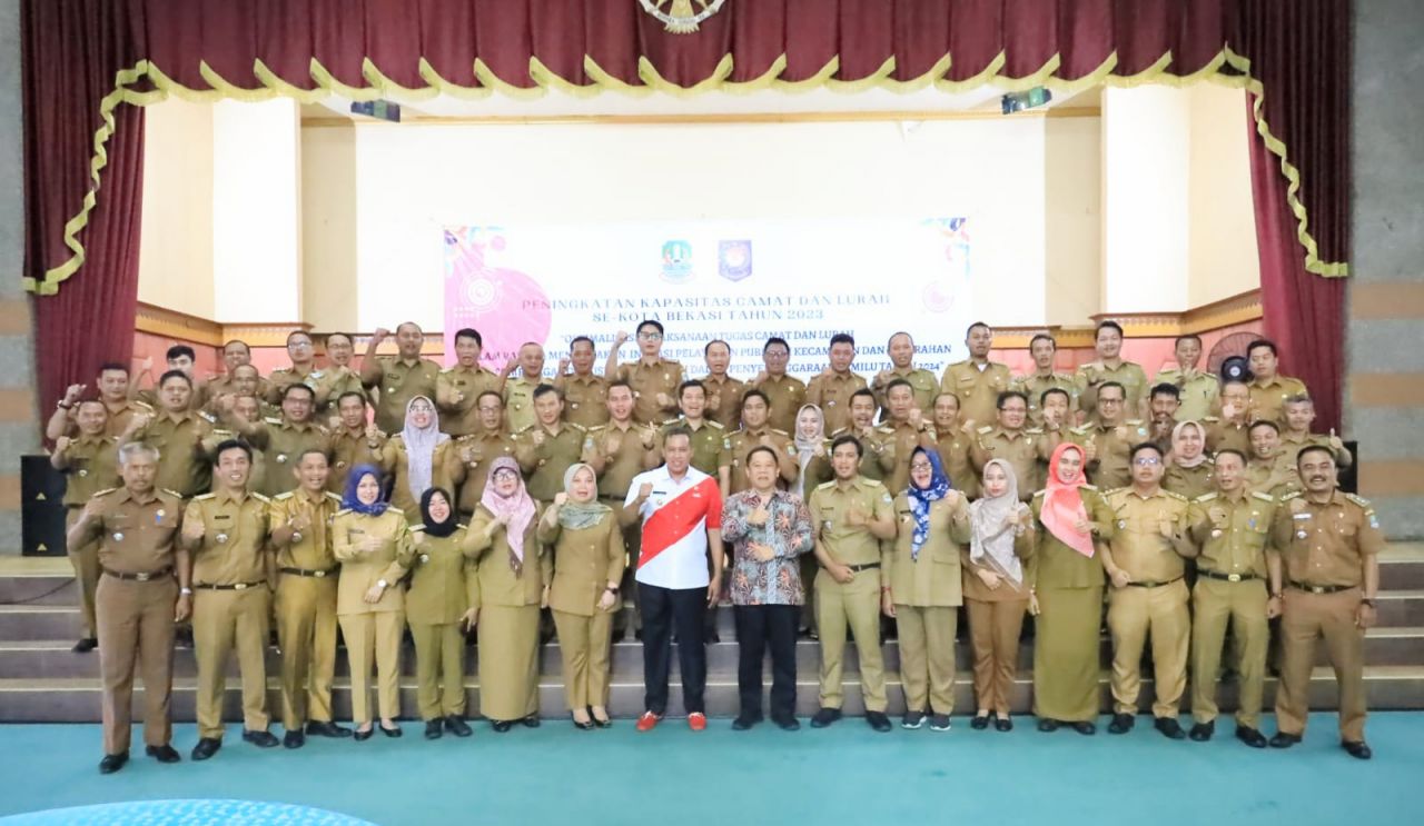 KOTA BEKASI (Beritakeadilan, Jawa Barat) – Acara peningkatan kapasitas bagi Lurah dan Camat se Kota Bekasi yang digelar di Balai Patriot Pemerintah Kota Bekasi dihadiri oleh Wali Kota Bekasi, Tri Adhianto dan narasumber dari guru besar ilmu pemerintahan IPDN, Prof. Dr. Fernandes Simangunsong, S.Stp, S.Ap, M.Si.