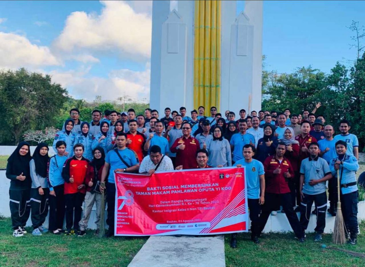 KOTA BAUBAU (Beritakeadilan, Sulawesi Tenggara)– Gelar bakti kebersihan di Taman Makam Pahlawan (TMP) Oputa Yiko Kota Baubau, jajaran Unit Pelaksana Teknis (UPT) Kementerian Hukum dan Hak Asasi Manusia Kota Baubau jadikan momentum Hari Lahir Kemenkumham ke-78 sebagai sarana berkolaborasi demi menjaga keharmonisan dan kekompakan di wilayah kerjanya, Kamis, (3/8) sore.