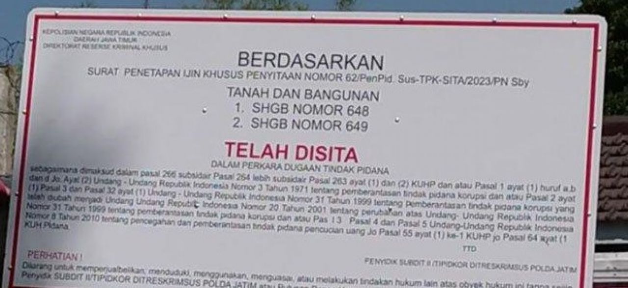 Berdasarkan pengamatan TribunJatim.com di lokasi, plakat tersebut, tertulis keterangan, Berdasarkan Surat Penetapan Ijin Khusus Penyitaan Nomor 62/PenPid. Sus-TPK-SITA/2023/PN Sby