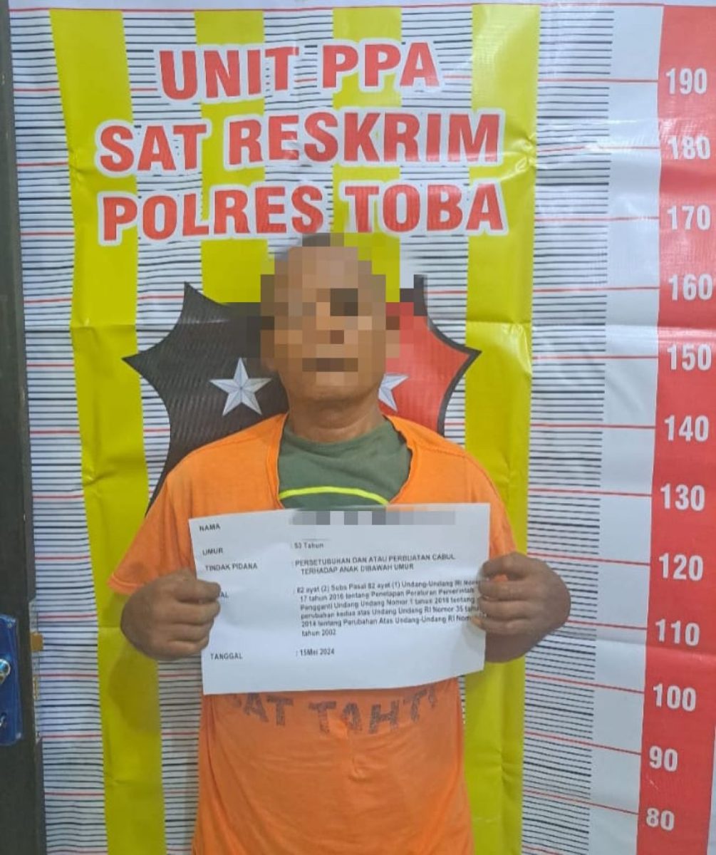KABUPATEN TOBA (Beritakeadilan. Sumatera Utara) – Pelaku pencabulan dan persetubuhan anak berusia 11 tahun ditangkap Satreskrim Polres Toba Polda Sumut Penangkapan dilakukan, Rabu (15/5/2024), dengan tersangka berinisial RMSS alias MS (53) warga Kecamatan Balige, Kabupaten Toba