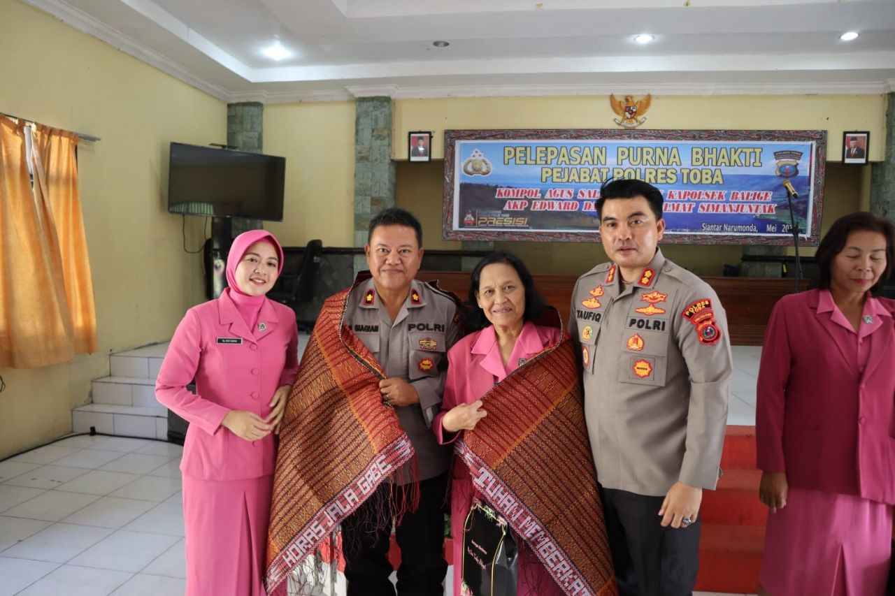 Pada kesempatan tersebut Kapolres Toba beserta ibu bhayangkaro cabang toba memberi cinderamata kepada personil yang akan memasuki masa purna bhakti berupa ulos.