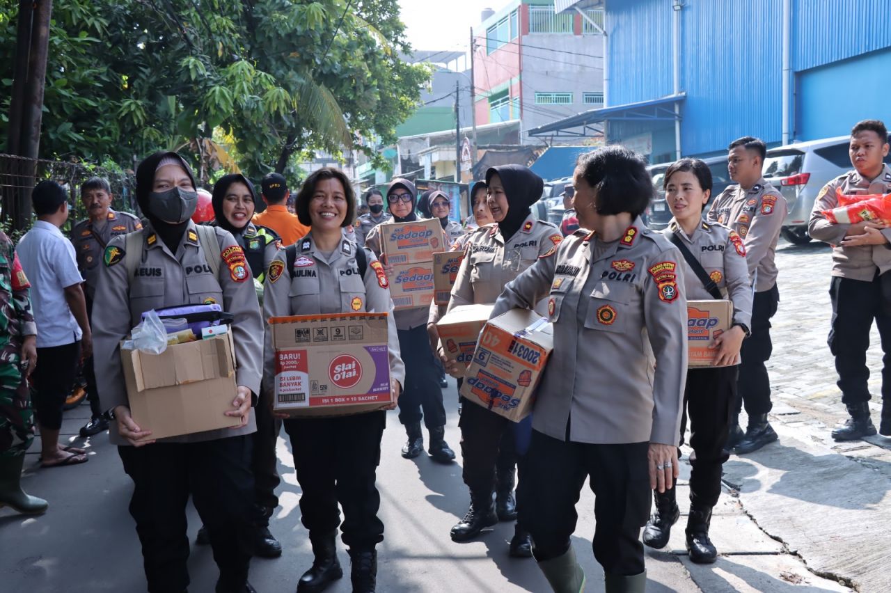 Kali ini, para Srikandi kepolisian (polwan) turun langsung ke lokasi banjir di Jalan Adhi Karya, RT 003/05, Kedoya Selatan, Kebon Jeruk, Jakarta Barat, untuk memberikan bantuan kemanusiaan kepada warga yang terdampak, Rabu, 5/3/2025.