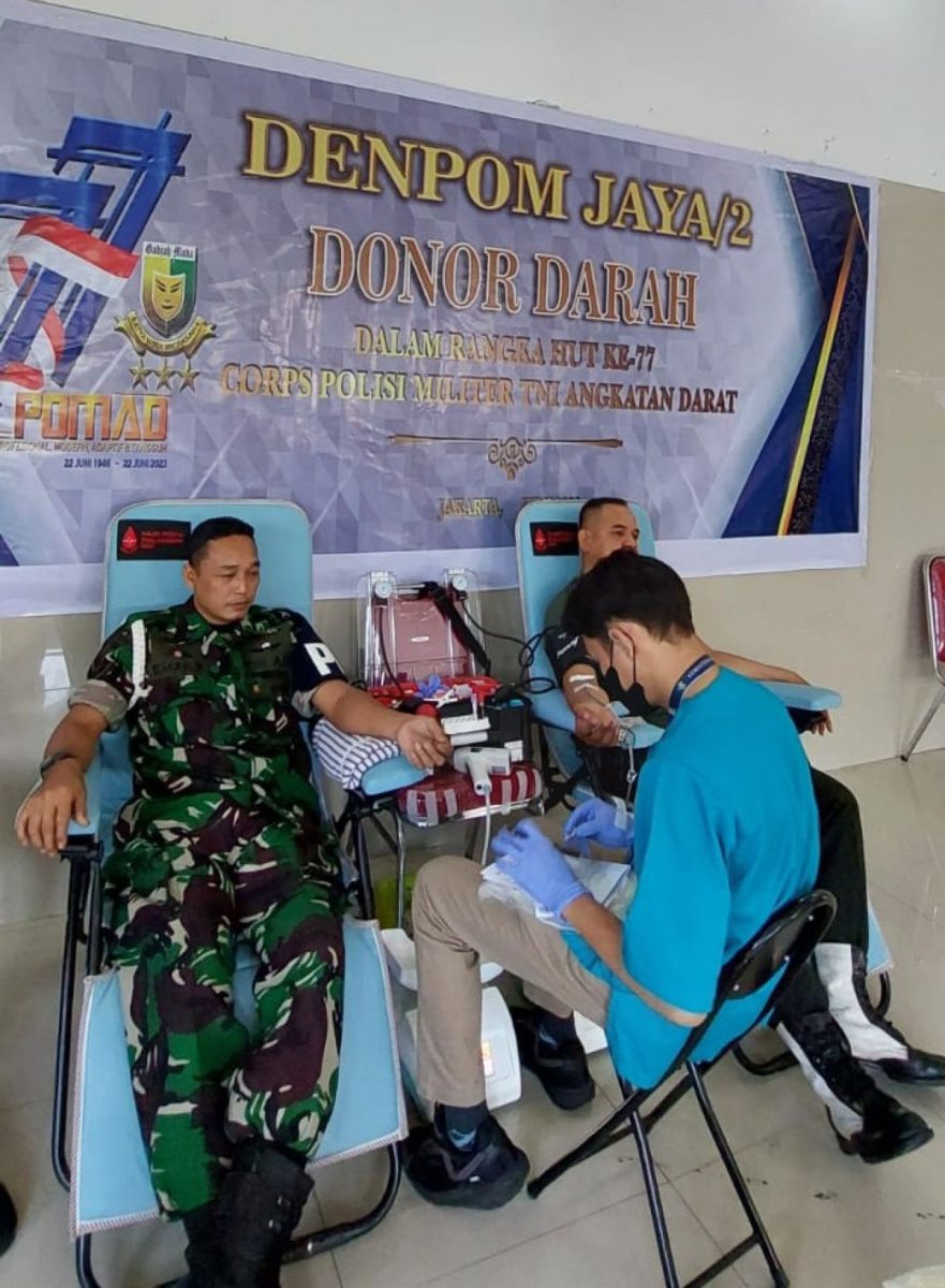 JAKARTA SELATAN (Beritakeadilan, DKI Jakarta) – Dalam rangka Hari Ulang ke-72 tahun 2023 Polisi Militer Angkatan Darat, Pomdam Jaya bekerjasama dengan Rumah Sakit Cipto Mangkusumo menggelar bakti sosial (baksos) donor darah di Mapomdam Jaya Jl. Sultan Agung No.33 Jakarta Selatan , Rabu (7/6/23).