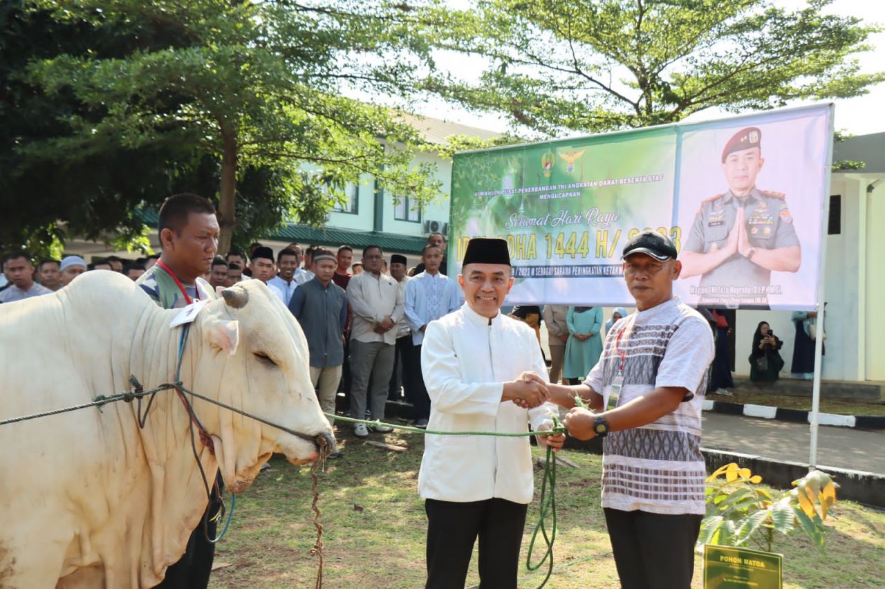 TANGERANG SELATAN (Beritakeadilan, Banten) – Komandan Pusat Penerbangan TNI AD (Danpuspenerbad) Mayjen TNI Toto Nugroho, , S.I.P., M.Si yang menyerahkan 8 ekor bewan kurban yang terdiri dari 3 ekor sapi dan 1 kombing ke DKM Mapuspenerbad, 1 ekor sapi ke Skadron 21/Sena, 1 ekor sapi ke Ponpes Daaruttahfidz Qur’an Lewiliang, 1 ekor sapi ke Mushollah Darul Iman Pondok Cabe Ilir, 1 ekor sapi ke Yayasan Bina Umat Pondok Cabe Ilir Pamulang, penyerahan dilaksanakan di Mapuspenerbad, Pondok Cabe, Tangerang Selatan, Banten. Kami (29/06/2023)