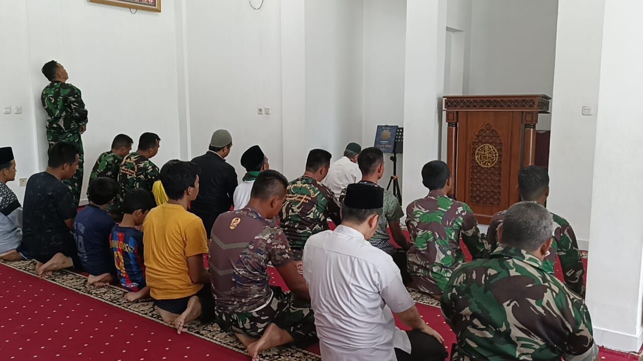 Selain fokus pada progam sasaran fisik dan non fisik, kegiatan ibadah juga tidak terlupakan, Terlihat dilokasi, saat terdengar suara adzan anggota Satgas TMMD bergegas melaksanakan shalat berjamaah Bersama warga di sekitar Masjid Nurul Jannah perumahan Puri Jakamulya yang tidak jauh dari lokasi kegiatan TMMD, Selasa, (16/5/2023).