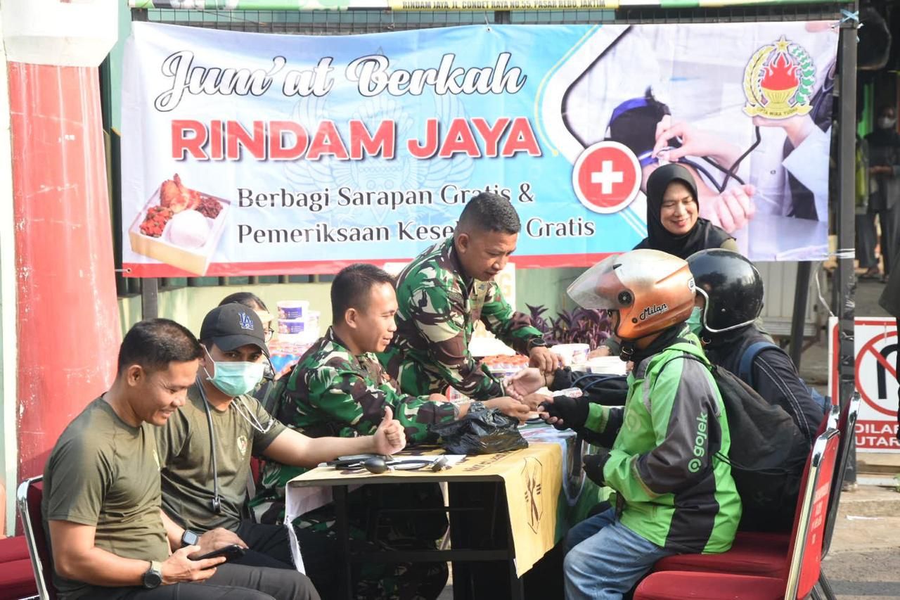 Jum’at Berkah Yang silaksanakan Rindam Jaya membagikan sekitar 300 paket berupa sarapan gratis, serta pemeriksaan kesehatan gratis oleh dr.Idul Saputra sebagai dokter Rindam Jaya terutama kepada, Ojek Online, Petugas Kebersihan, dan Masyarakat di seputaran Rindam Jaya.