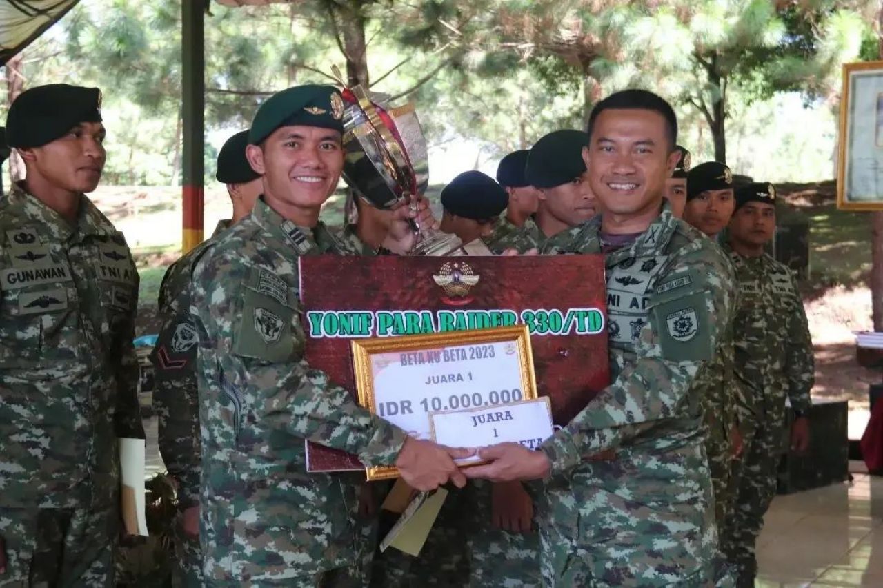 Pada kesempatan tersebut, Danyonif PR 330/TD, Mayor Inf Dedy Pungky Irawanto, S.I.P, M.I. Pol. menyerahkan Piala Bergilir Beta Ku Beta 2023 kepada Dankipan A dan hadiah uang pembinaan kepada pemain terbaik dari setiap cabang olahraga.