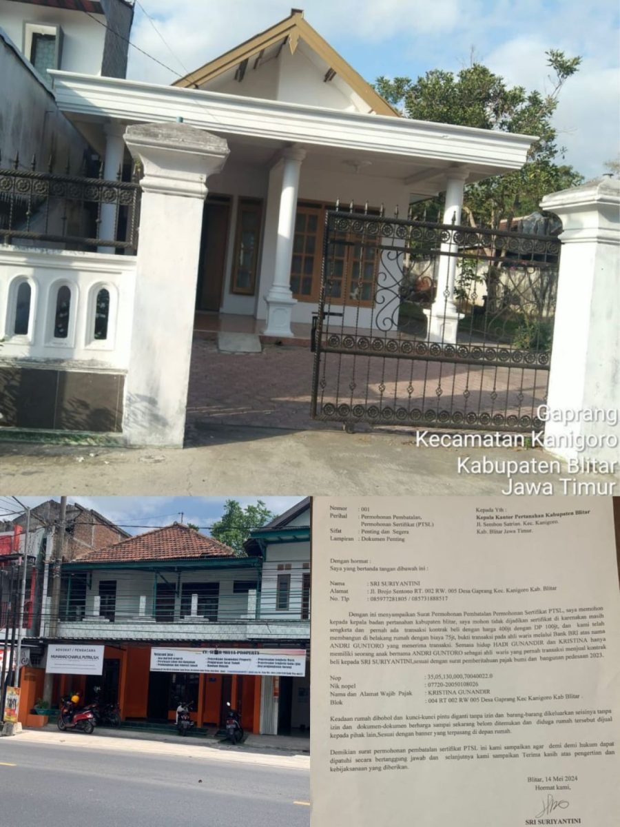 KABUPATEN BLITAR (Beritakeadilan Jawa Timur)-Direktur CV. Sinar Mulya Property, Sunarmi yang berkantor di Jalan Kalimantan RT 04/RW 02, Kelurahan Sanan Wetan, Kecamatan Sananwetan, Kota Blitar ini benar-benar nekat. Bagaimana tidak, Sunarmi diduga menjual rumah Jl. Brojo Sentono, RT 02/RW 05, Desa Gaprang, Kecamatan Kanigoro, Kabupaten Blitar yang masih Terikat kontrak jual beli antara Andri Guntoro dengan Sri Suriantini. Dimana Sri Suriantini dan Andri Guntoro sudah terjadi Kesepakatan harga Rp 400 juta dan sudah terbayarkan Rp 100 juta kepada Andri Guntoro. Sementara Sunarmi tanpa sepengetahuan Sri Suriantini, Sunarmi melakukan jual beli ke Wildan Mush’ab Bachtiar dengan transaksi pembelian cash Rp. 400 juta.