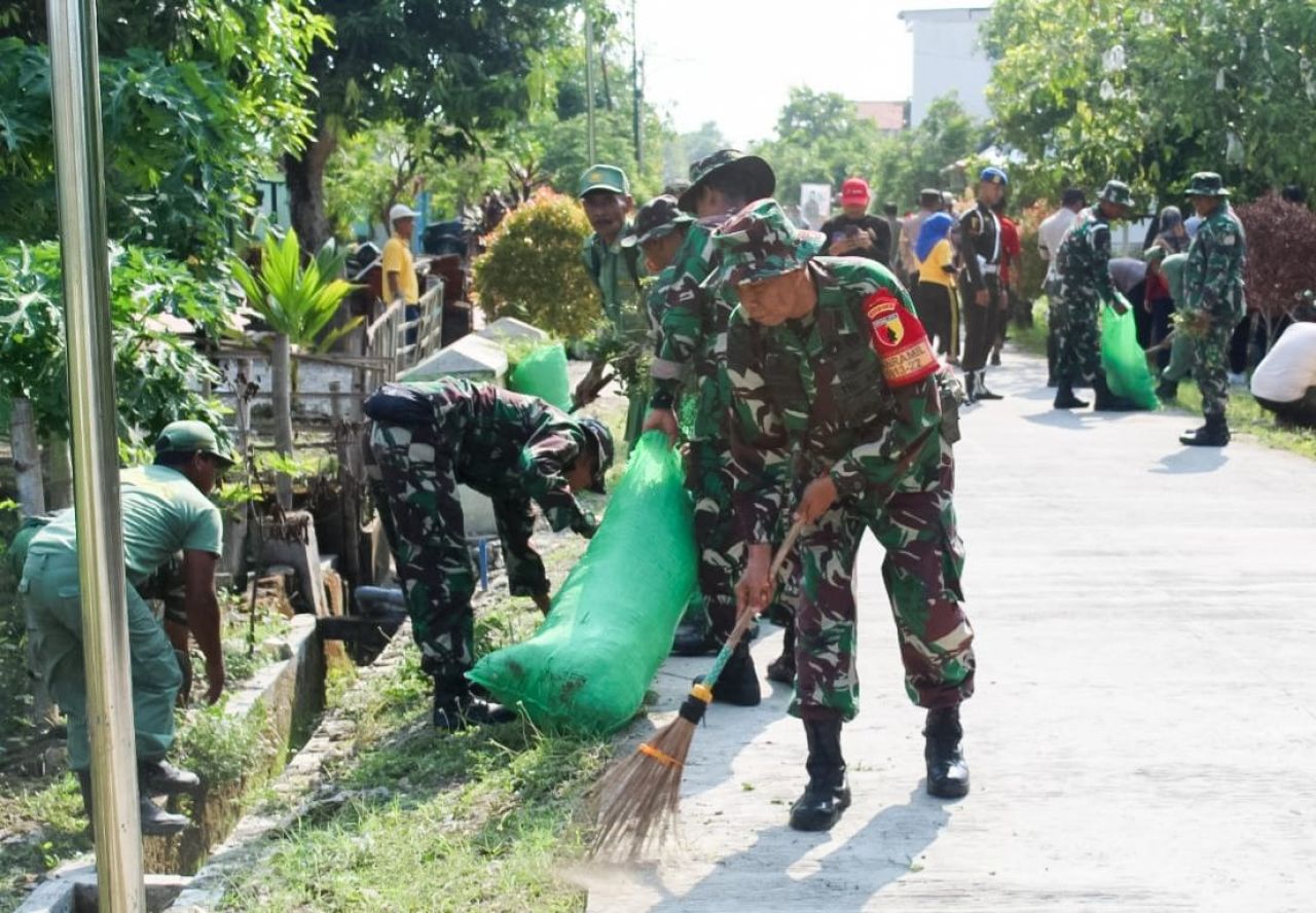 BOJONEGORO (BeritaKeadilan, Jawa Timur)- Sebagai bentuk kepedulian terhadap kebersihan lingkungan, jajaran Bintara Pembina Desa (Babinsa) Kodim 0813 Bojonegoro, Jawa Timur, pagi ini Kamis (7/12/2023), serentak menggelar kegiatan karya bakti TNI pembersihan lingkungan pasar, selokan/parit dan sungai serta penanaman pohon di 21 kecamatan se- Kabupaten Bojonegoro.
