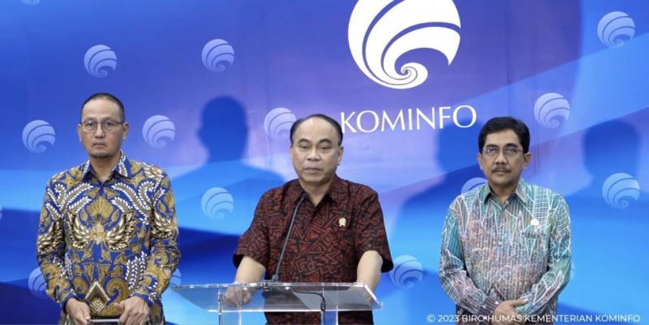Dalam konferensi pers, Menkominfo Budi Arie Setiadi didampingi Direktur Jenderal Aplikasi Informatika Semuel A. Pangerapan dan Staf Ahli Menteri Bidang Komunikasi dan Media Massa Widodo Muktiyo. (red/humas)