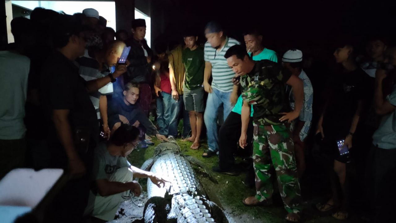 Sertu Moh Yana, Babinsa Koramil 0115/Cimanggu Kodim 0601/Pandeglang bersama warga melakukan pengejaran buaya yang meresahkan warga. Buaya yang diperkirakan berukuran 3 meter ini ditangkap pada malam hari. Penangkapan Buaya, kami telah berkoordinasi dengan Muspika Kecamatan Sumur untuk dilaporkan dan diserahkan ke Balai Konservasi Sumberdaya Alam (BKSDA) Banten, tutur Sertu Moh Yana..