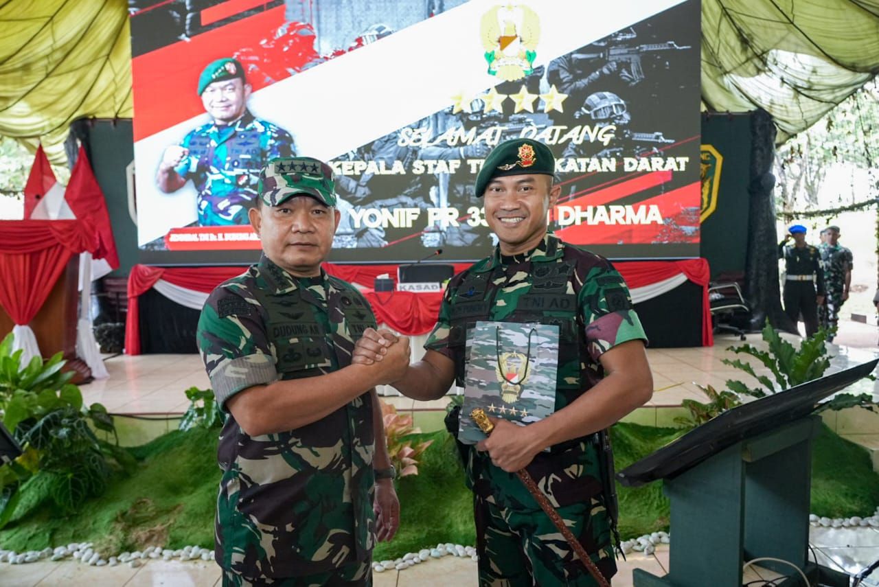 Pangkostrad dan Kasad yang tiba terlebih dahulu, menerima gambaran kesiapan operasi melalui paparan Danyonif PR 330/Tri Darma, Mayor Inf Dedy Pungky Irwanto, S.I.P.,M.I.Pol., sebelum kedatangan Menhan RI di Mako Yonif PR 330/Tri Darma.