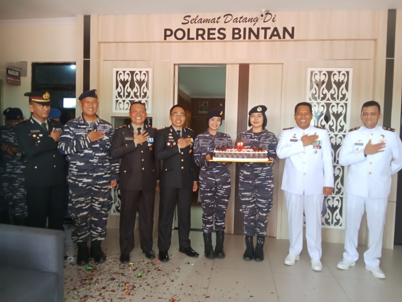 Danlanal beserta Prajurit Lanal Bintan, selesai mengikuti upacara HUT Bhayangkara ke-77 yang dilaksanakan di Lapangan Apel Kantor Bupati Bintan langsung bergerak menuju Polresta Bintan. Dengan beriringan mereka membawa kue tart bertuliskan HUT Bhayangkara ke-77, sambil menyanyikan lagu ”Selamat Ulang Tahun” bagi Kepolisian.
