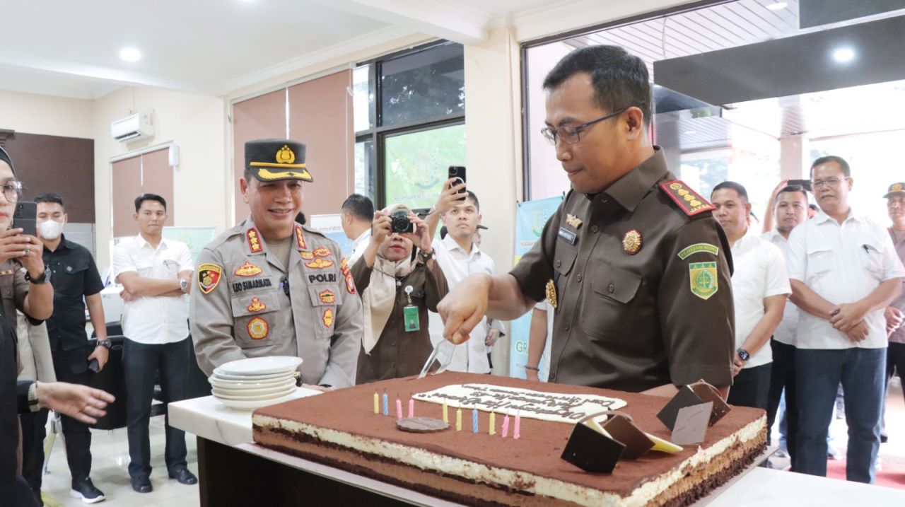 Acara-pun berlanjut pemotongan kue serta ramah tamah yang penuh kebersamaan di kedua instansi penegak hukum tersebut.