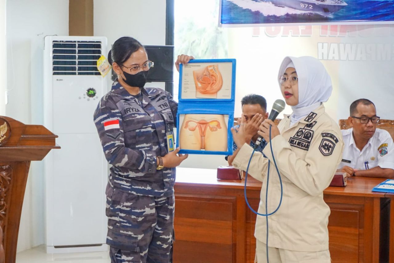 Dinas Kesehatan (Diskes) Lantamal XII dengan Tim Kesehatan Satgas pada kesempatan ini memberikan materi tentang Stunting dan Keluarga Berencana (KB) untuk masyarakat Desa Sungai Bakau Besar Laut.
