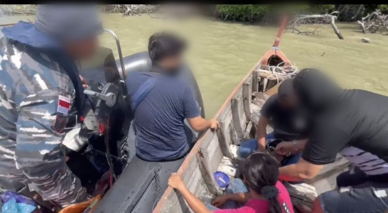 Dikarenakan area kandas yang rawan, 3 Personel F1QR Lanal TBA lompat ke laut untuk mengejar mendekat sampan penumpang perempuan dan juga mengejar pelaku tekong yang kabur.
