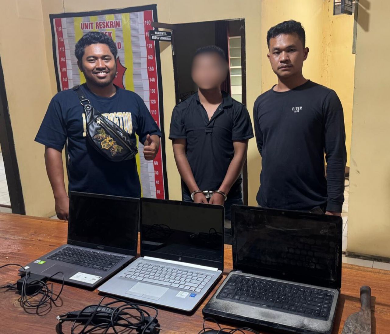Pada hari Jumat tanggal 22 Februari 2025 sekira pukul 11.00 Wib, Personil unit Reskrim yang dipimpin oleh Bripka Kennedy Butarbutar berhasil mengamankan pelaku Pencurian berinisial JM dan PM selanjutnya mengamankan barang bukti Laptop dan alat yang digunakan para pelaku untuk melakukan aksi pencurian.