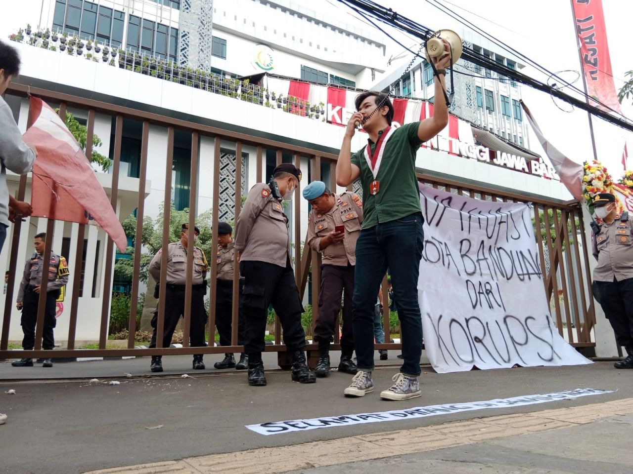 KOTA BANDUNG (Beritakeadilan, Jawa Barat)- Sejumlah mahasiswa yang tergabung dalam Gerakan Mahasiswa Nasional Indoensia (GMNI) Kota Bandung menggeruduk Gedung Kejaksaan Tinggi (Kejati) Jawa Barat (Jabar) Jumat (21/7). Selain melakukan orasi, mahasiswa juga membentangkan spanduk di pagar halaman Kejati Jabar dengan sejumlah tuntutan. Di antaranya, kasus korupsi yang mandeg juga soal kebisingan tempat hiburan malam yang menganggu warga di Kota Bandung. Kasus korupsi yang diusung mahasiswa itu soal hibah taman pramuka dan revitalisasi taman pramuka yang menurut mahasiswa dinyatakan mandeg karena sudah satu tahun tidak ada perkembangan.