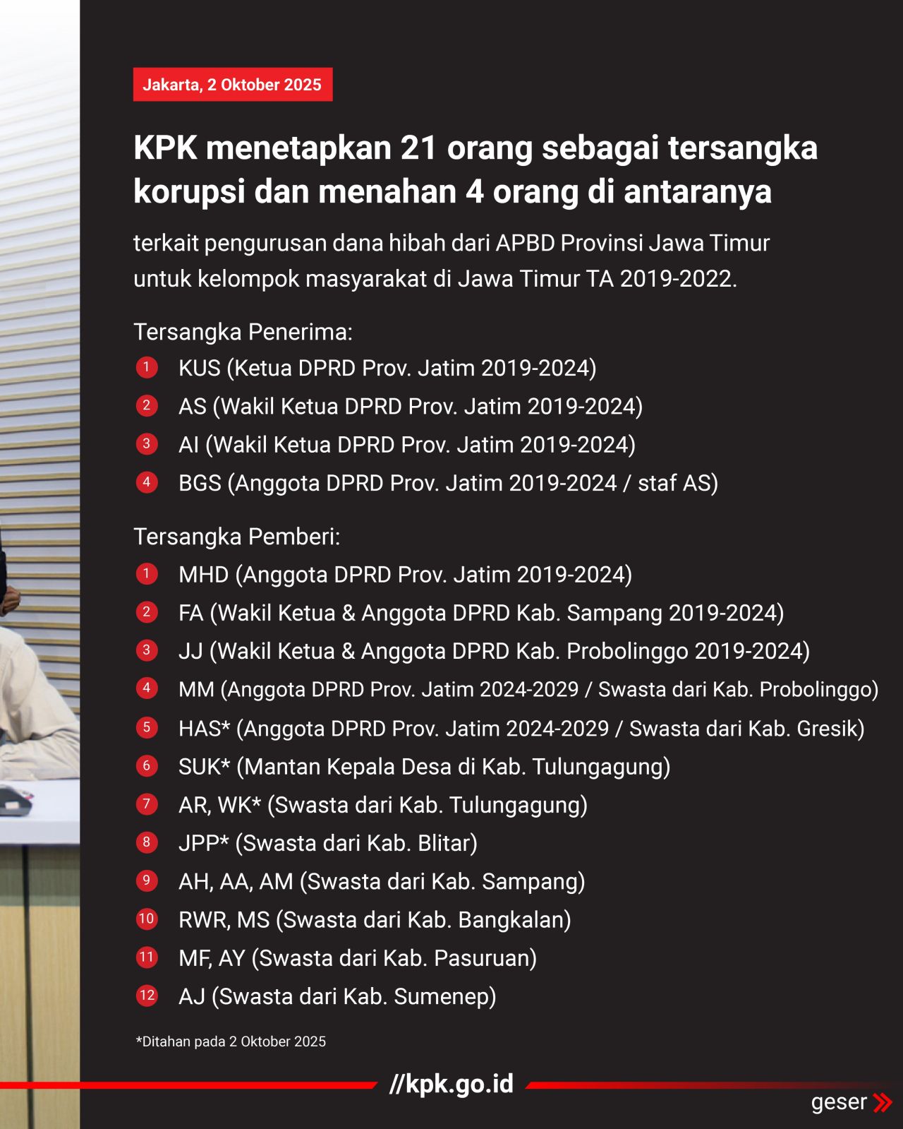 - Awal 2025: KPK menetapkan 21 tersangka.